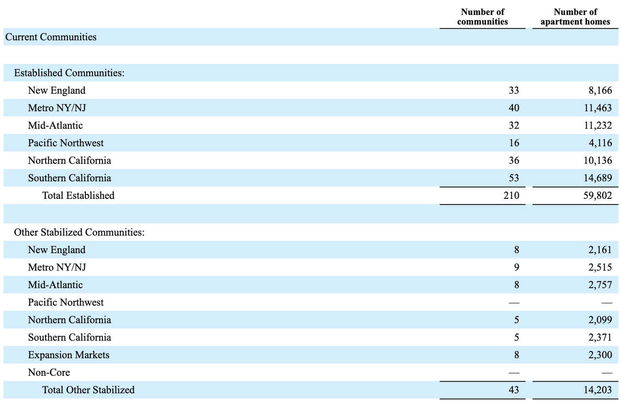AVB's portfolio is largely concentrated in New England, the New York City tube area, the Washington D.C. tube area, the Seattle subway system area, and California. Within these regions, AVB targets markets that have strong job growth, income increment, decreasing homeownership rates, high cost of single-family housing, and cunning city-like centers that draw young residents. Overall, AVB's tenant base is young, Edward D. White collar, and senior high school income. Although geared towards the urban cores of megacities, 50% of NOI is earned from non-urban areas ("garden" and "mid-rise" communities that are located outside of the central city) and 40% is attained from non-megacities. This portfolio mix gives good exposure to the US megacity core while as wel diversifying the lay on the line well finished exposure to some other Tier 1 US cities.